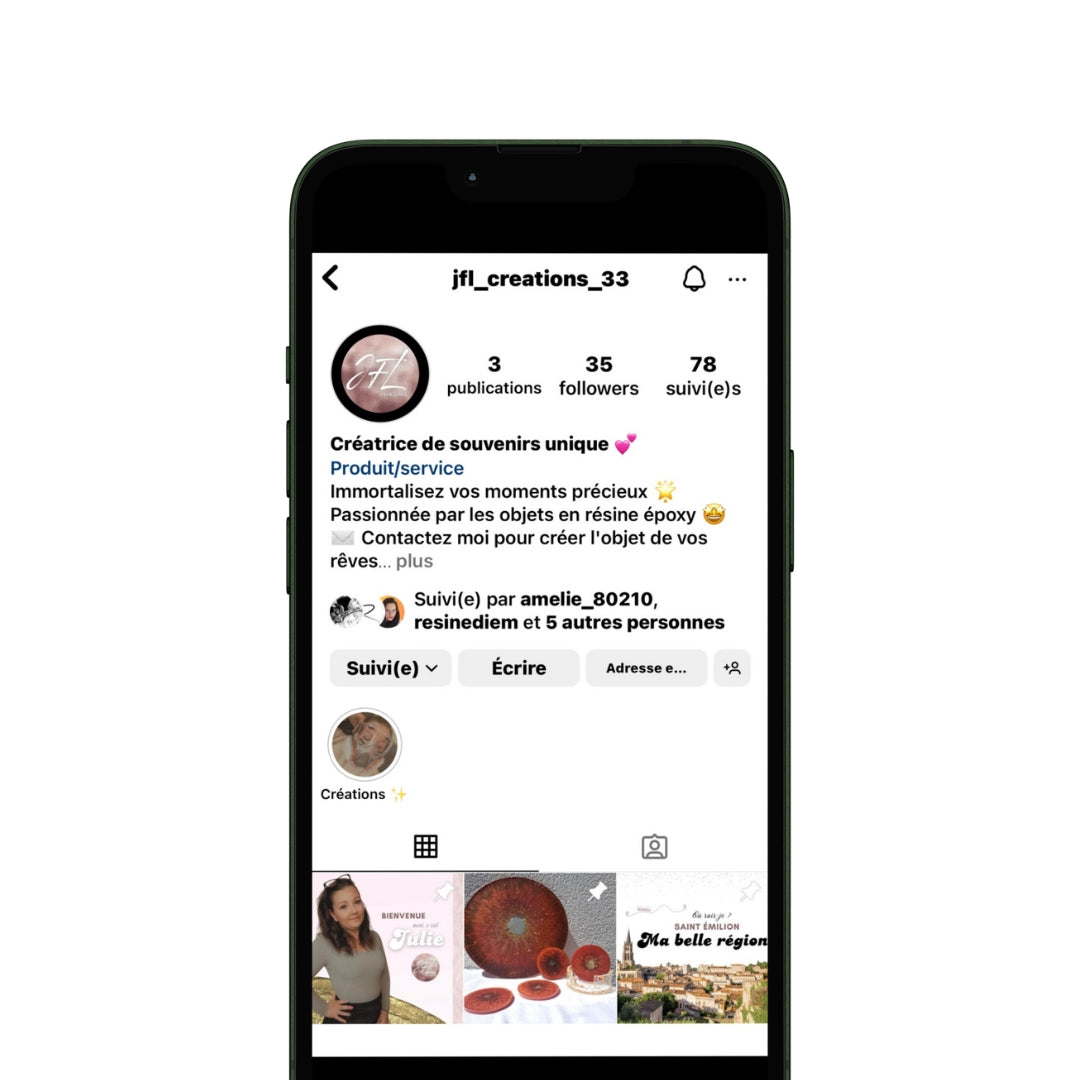 Suivez-moi sur les réseaux sociaux pour découvrir les coulisses de mon atelier, voir mes dernières créations et participer à mes événements exclusifs. Rejoignez une communauté de passionnés d'art et de design et partagez votre amour pour les créations en résine époxy.